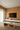 Дизайнерский кофейный столик стал центром притяжения в зоне. Внутри — шпон, снаружи — эмаль и стекло. Несколько материалов переплетены так, что стол одновременно ощущается лёгким и сложным: прозрачность стекла смягчает массивность шпона, а эмаль подчёркивает современный минимализм.